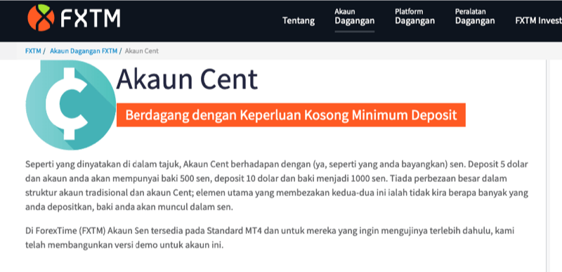 Sementara Akaun Standard FXTM adalah baik dengan deposit minimum 100 USD dan spread bermula dari 1.3 pip, FXTM juga menawarkan Akaun Sen dengan seposit minimum hanya 10 USD namun dengan spread yang sedikit lebar, bermula dari 1.5 pip.
