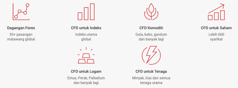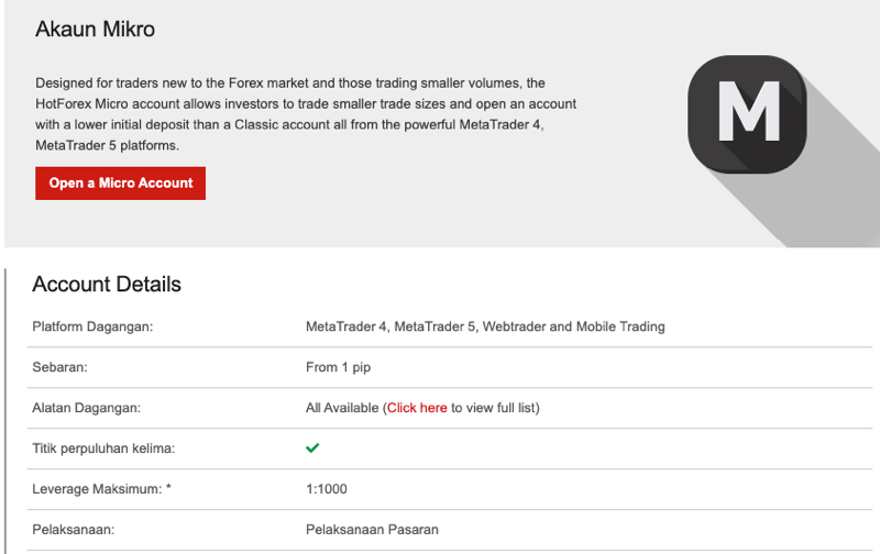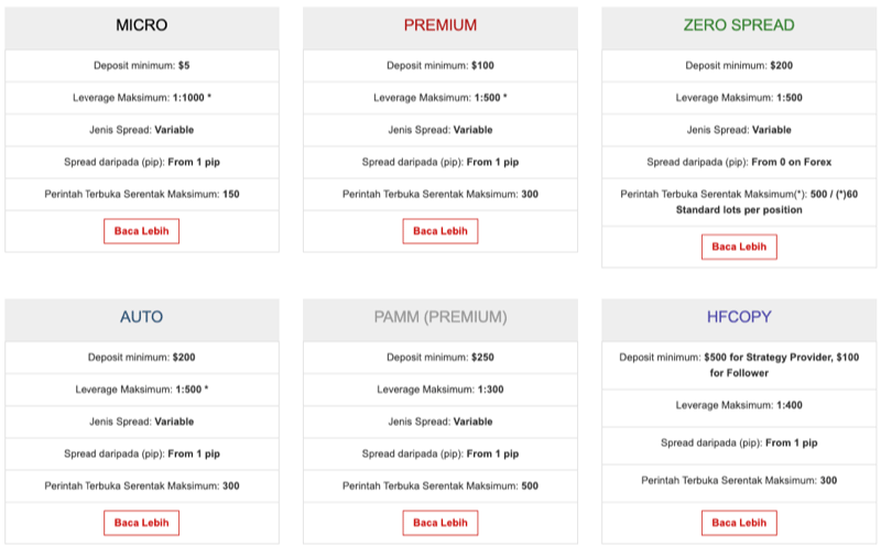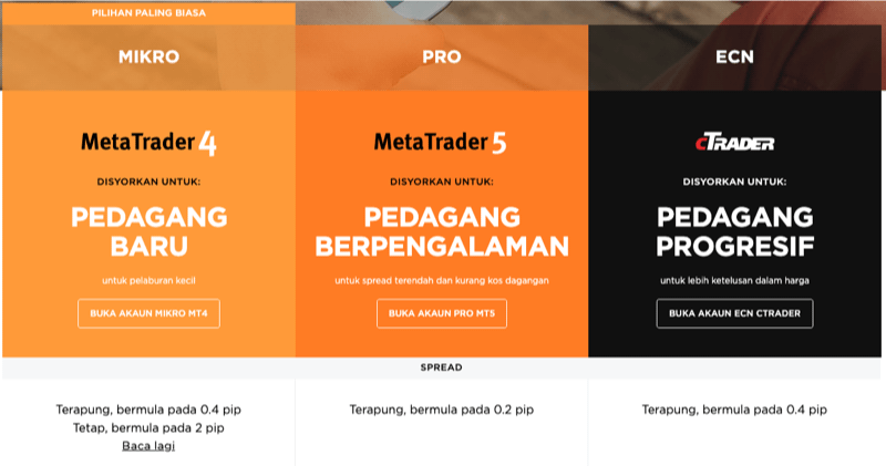 | Menawarkan tiga jenis akaun- Micro, Pro dan ECN. | |